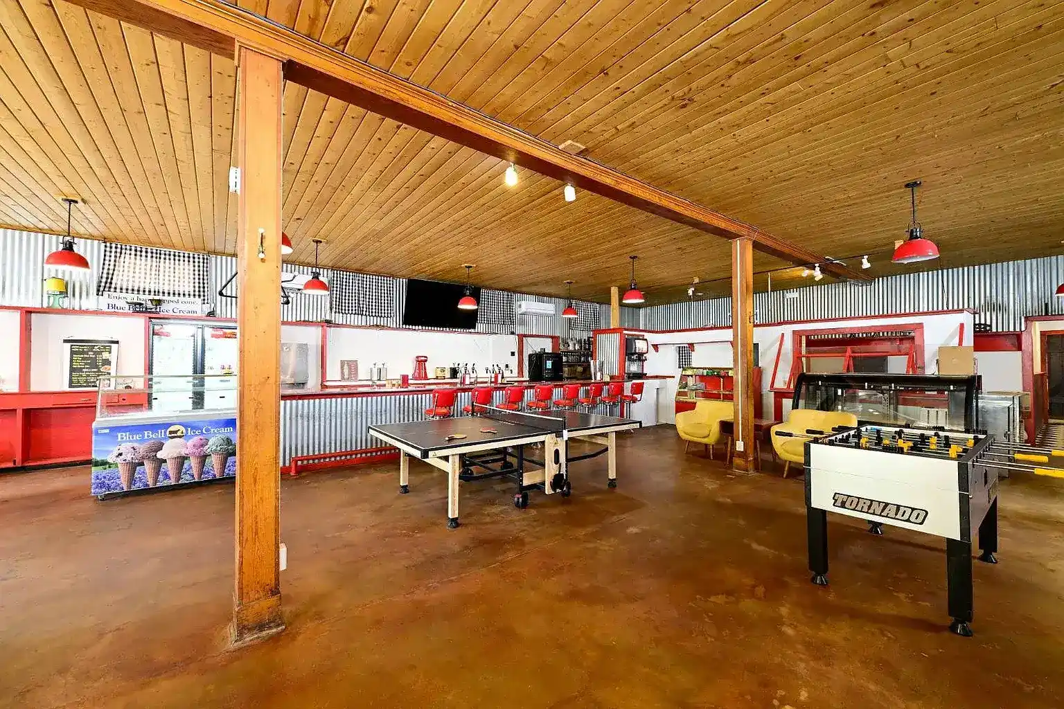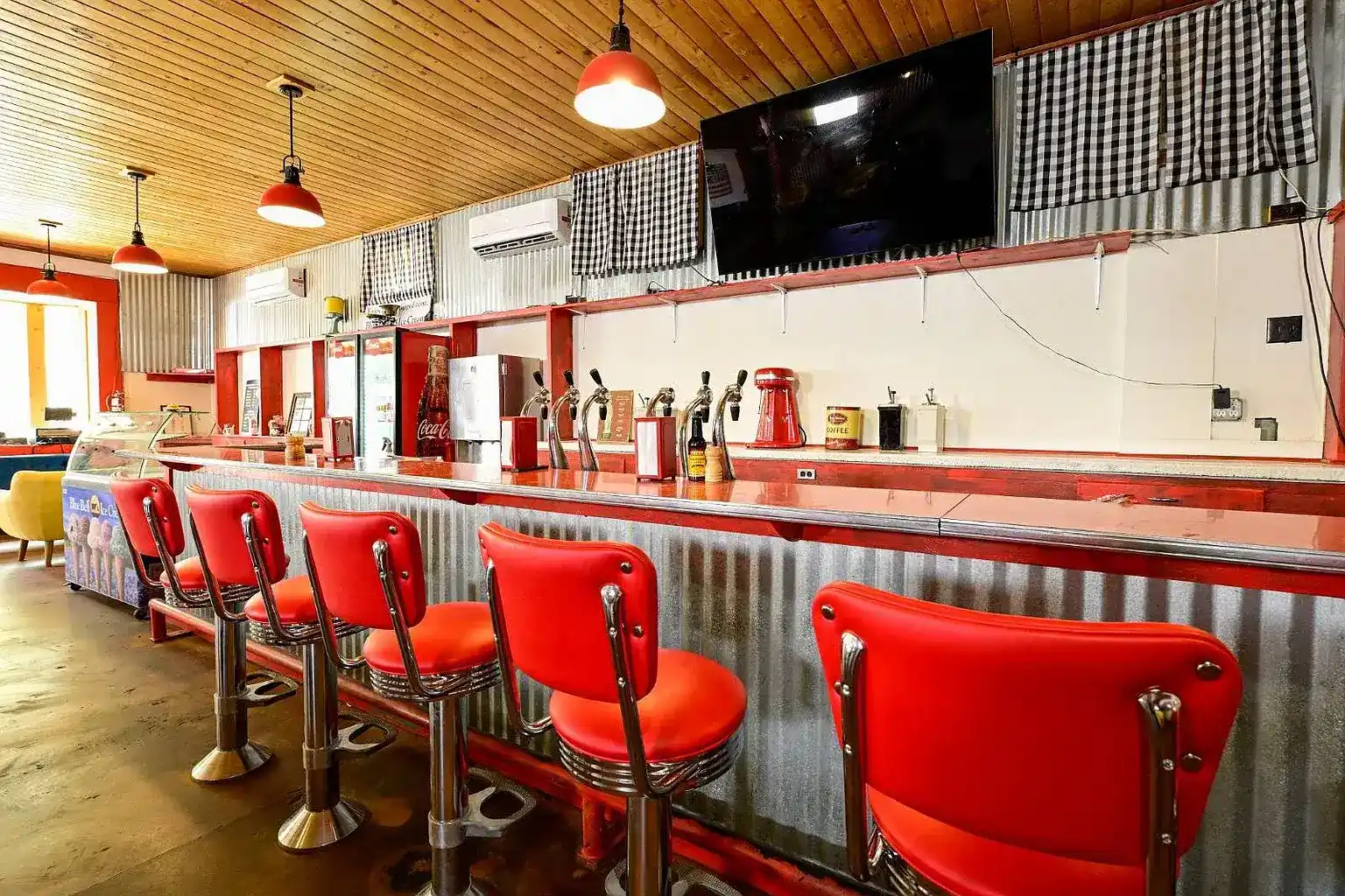 Once a bustling restaurant and soda fountain, now a 2,100 square foot lounge exclusively for hotel guests. The original 1950s soda fountain counter is still here — now with a 75" TV above it. Accessible 24/7.